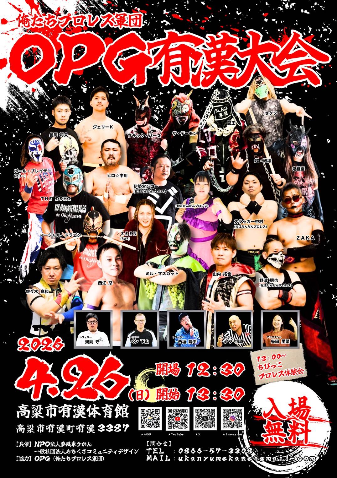 HOME > 大会情報 > 大会情報 【4月26日(日)】有漢大会 大会情報! 2026年3月30日 【4月26日(日)】有漢大会の情報です。日時:4/26(日) 開場12:30 開始13:30 ※13:00からちびっこプロレス体験会を予定 場所:高梁市有漢体育館岡山県高梁市有漢町有漢3387 https://g.co/kgs/UK4yBbYアクセス:岡山道有漢ICから車で5分備中高梁駅から車で25分備北バス 有漢地域局バス停から徒歩3分共催:NPO法人夢風車うかん一般社団法人みちくさコミュニティデザイン 観戦無料!!奮ってご観戦くださいませ! Post Share Pocket Hatena LINE URLコピー -大会情報